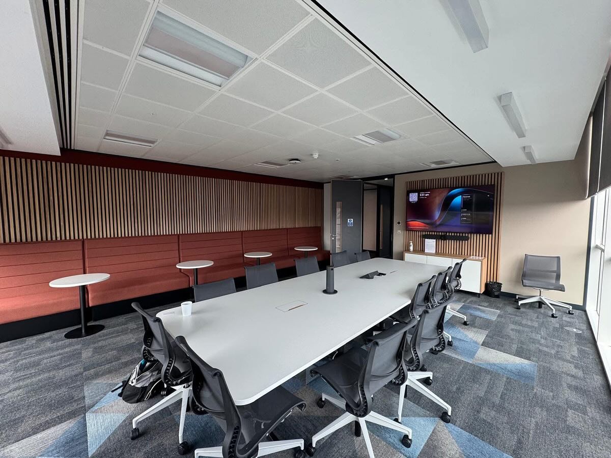 The conference room, with its sleek timber slats, acoustic rafts, and carefully curated glass manifestations, balances style with acoustic efficiency, ensuring a dynamic yet focused environment for discussions. The interplay of slate greys and blues lends a contemporary sophistication, while the sage green breakout space provides a refreshing retreat, reinforcing the importance of both productivity and well-being within the workplace.