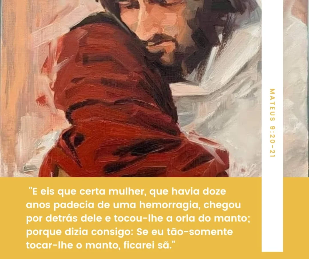 Boa tarde! Essa é uma reflexão profunda sobre a cura e a liberdade proporcionadas pela fé. Relata a história de uma mulher que, após sofrer por doze anos com uma hemorragia, encontra em Jesus a esperança de transformação… Apesar das dificuldades e das normas religiosas de sua época, que a consideravam impura, ela demonstra coragem ao tocar na orla do manto de Jesus, acreditando que seria curada. Essa fé e determinação resultam em sua cura!